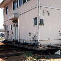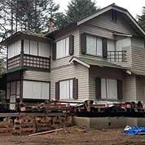 土台の下に鋼材を入れ建物を移動する。